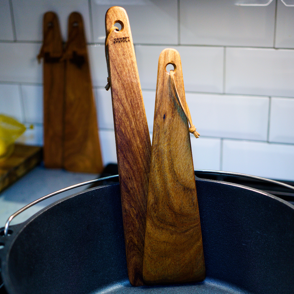 Tried and true, these Texas Mesquite wood spatulas are a great companion to your cast iron skillets and all your pots and pans - even those non-stick surfaces, too. It's also the perfect partner for your next trip as it takes up less space than a metal spatula! This wooden cooking tool is one that you will pass down through your family for generations to come.